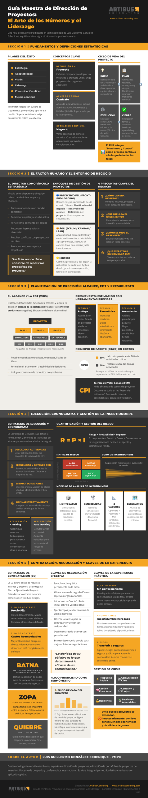 Esta obra expone los principios fundamentales para conducir proyectos combinando claridad en la estrategia, precisión técnica y sensibilidad hacia las personas. Su autor, el ingeniero colombiano Luis Guillermo González Echenique, reconocido especialista en la materia, propone herramientas concebidas desde el contexto latinoamericano pero con alcance y utilidad a escala mundial. El libro resulta valioso para cualquier persona interesada en la gestión de proyectos, tanto para quienes se inician en el campo como para directores con trayectoria especializada. Su contenido es denso en información, con explicaciones accesibles y minuciosas. Incorpora situaciones reales, definiciones conceptuales, casos ilustrativos y referencias a figuras destacadas del ámbito. En conjunto, constituye una guía cercana, generosa en su propuesta, exhaustiva en su cobertura y rigurosa en su tratamiento del arte de dirigir proyectos.